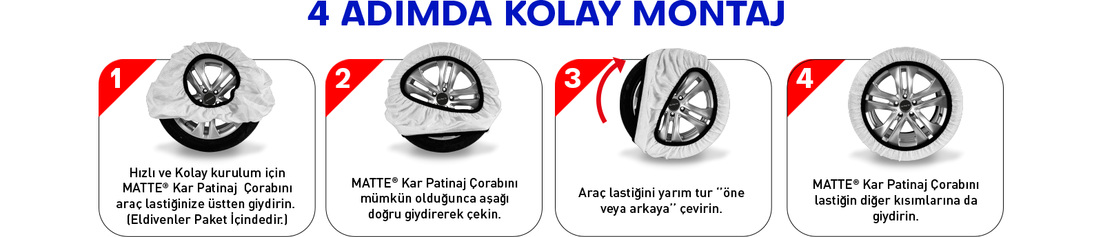 İleri teknoloji tekstil ürünlerinden imal edilen Matte® Kar Çorabı ile aracınız 4 adımda sürüşe hazır hale gelir.